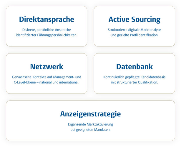 Die erfolgreiche Besetzung von Führungspositionen erfordert einen strukturierten Multichannel-Ansatz. Je nach Mandat, Marktumfeld und Sensibilität kombinieren wir gezielt verschiedene Suchinstrumente. Nicht jeder Kanal ist für jede Position geeignet – entscheidend ist die strategische Auswahl.